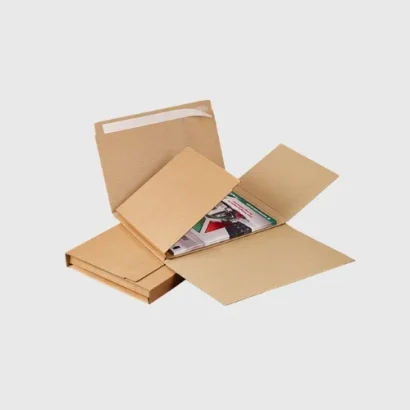 Our book packaging stands out for its combination of robust protection and versatility. Using sustainable corrugated cardboard with high durability, it effectively prevents damage such as bending, crushing, or kinking. The packaging adapts to various book sizes and thicknesses through flexible designs like wrap-around styles with secure self-adhesive closures and tear-off strips, allowing both protection and easy access. Compared to simple envelopes or soft covers, our packaging offers enhanced shock absorption and stability. The packaging also delivers a large printable area to communicate your brand’s message, increasing customer engagement and recognition.